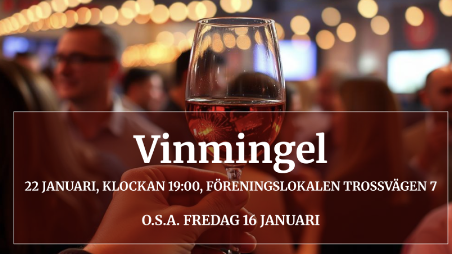 Styrelsen vill bjuda in alla medlemmar till årets vinmingel – ett tillfälle för oss att träffas och umgås under lättsamma former. Fokus kommer att vara på att må bra och få något gott i glaset. Styrelsen kommer passa på att informera om det gångna året samt vad som är på gång under 2026 i vår förening.